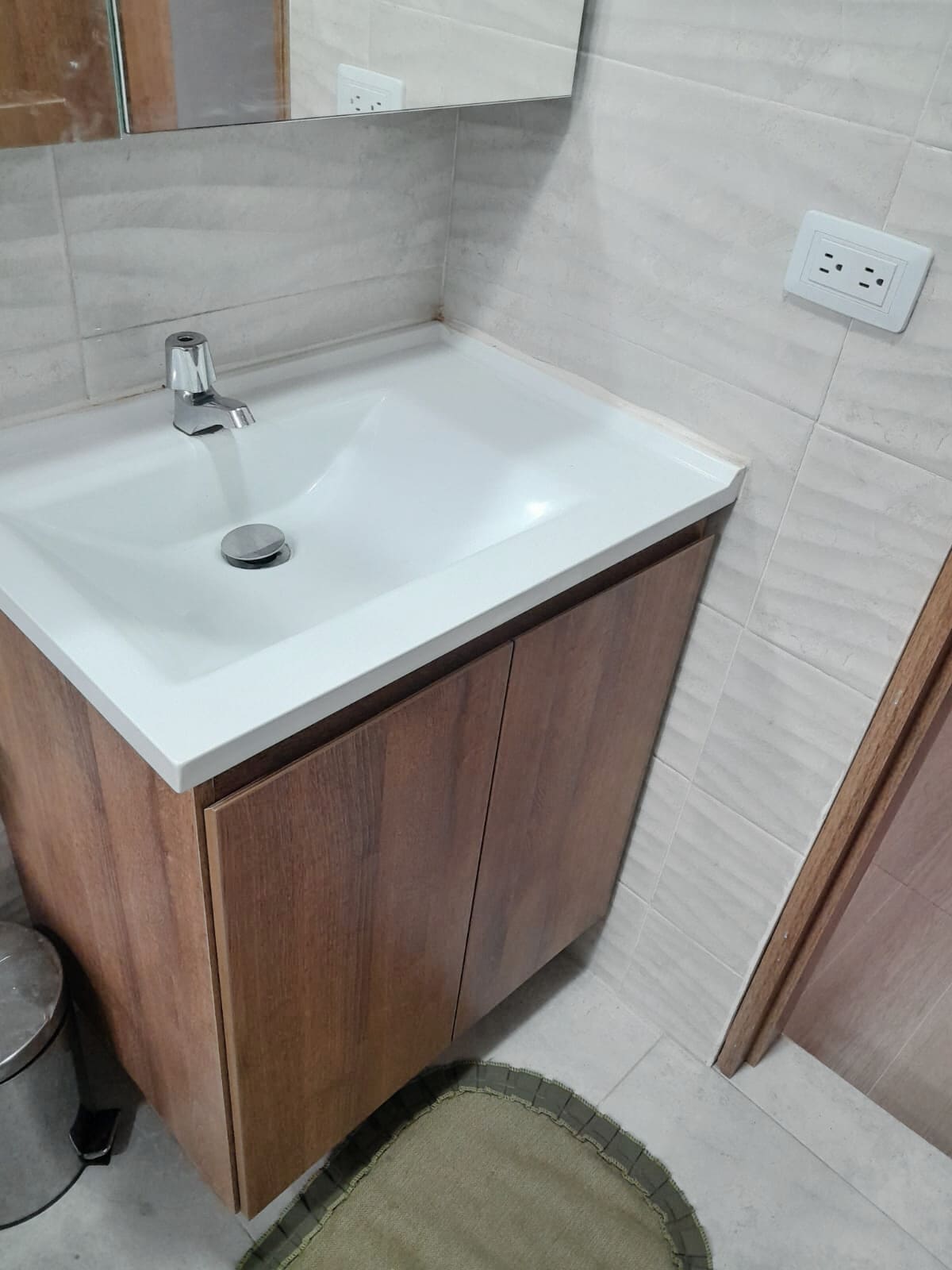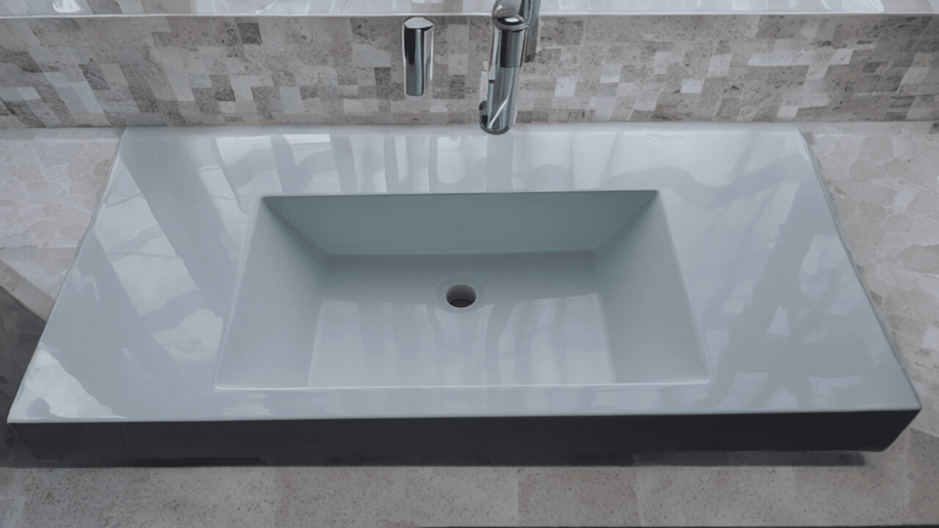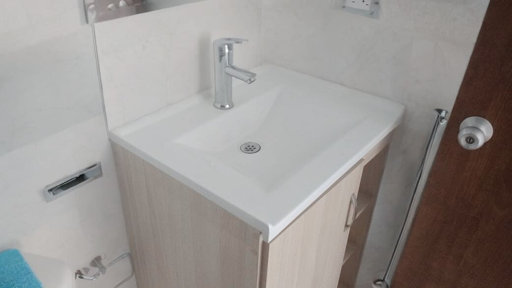 Lavamanos en mármol procesado y reforzado en fibra de vidrio en color blanco terminado en 15ml aprox. en contorno con su respectivo mueble.