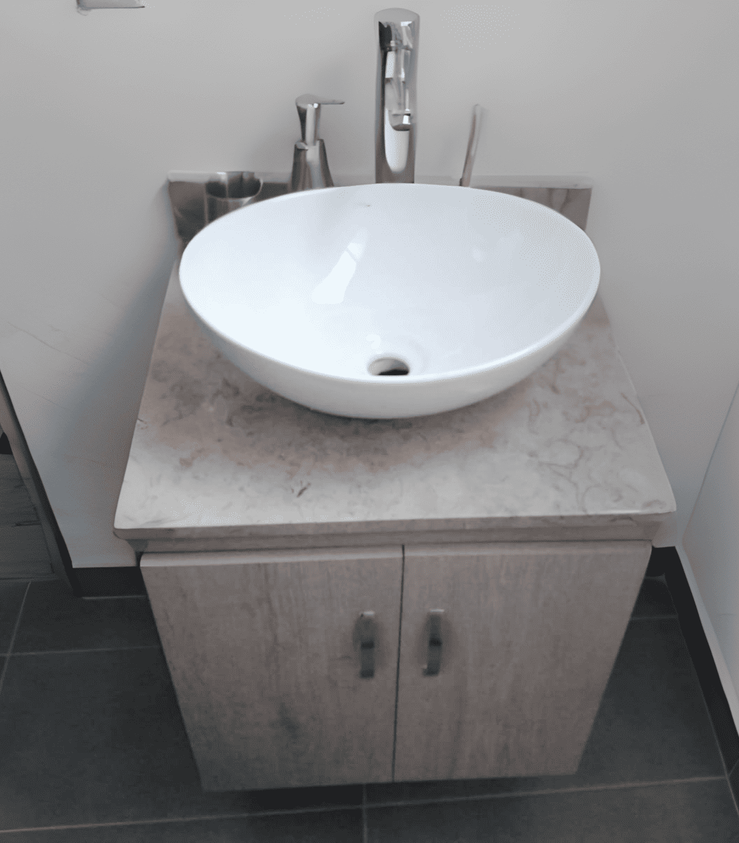Lavamanos de sobreponer tipo circular en mármol sintético con su respectivo mueble.